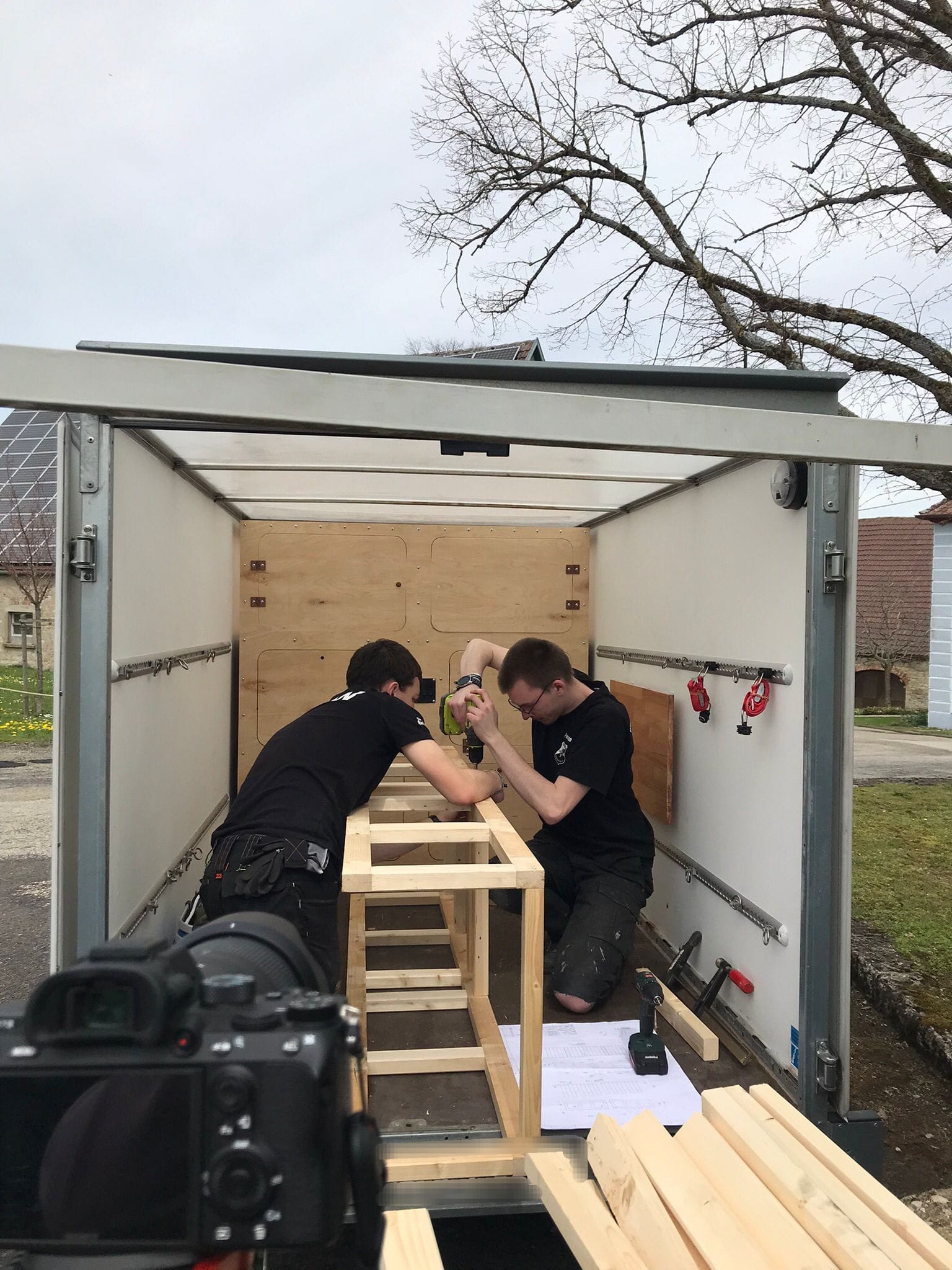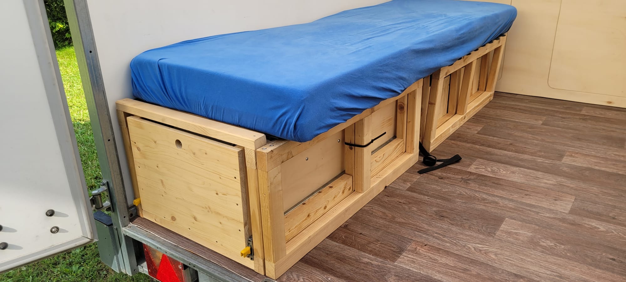 Auch das Bett sollte überarbeitet werden. Während ich die Balken gegen einen passenden Lattenrost ausgetauscht habe, hatte sich Sven um Stauraumkisten für den hinteren Teil des Bettes gekümmert. Somit konnte nun noch mehr Material verstaut und deutlich entspannter geschlafen werden.