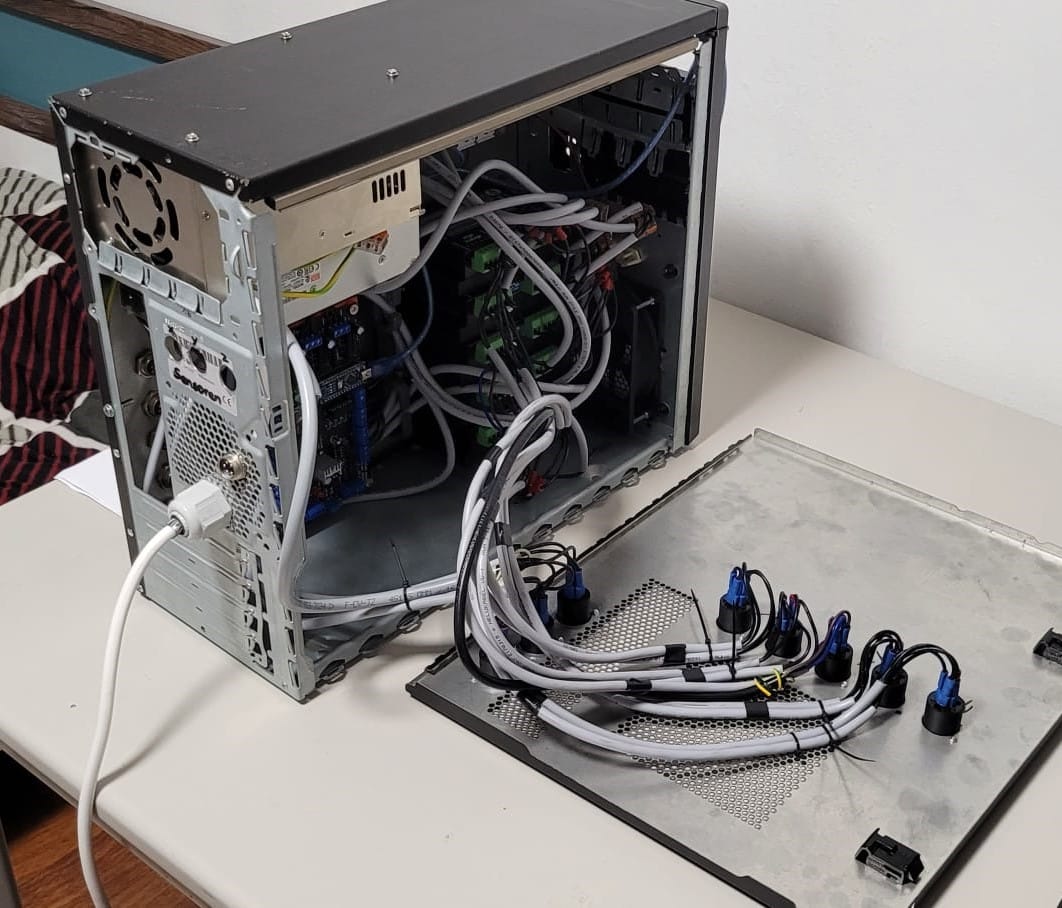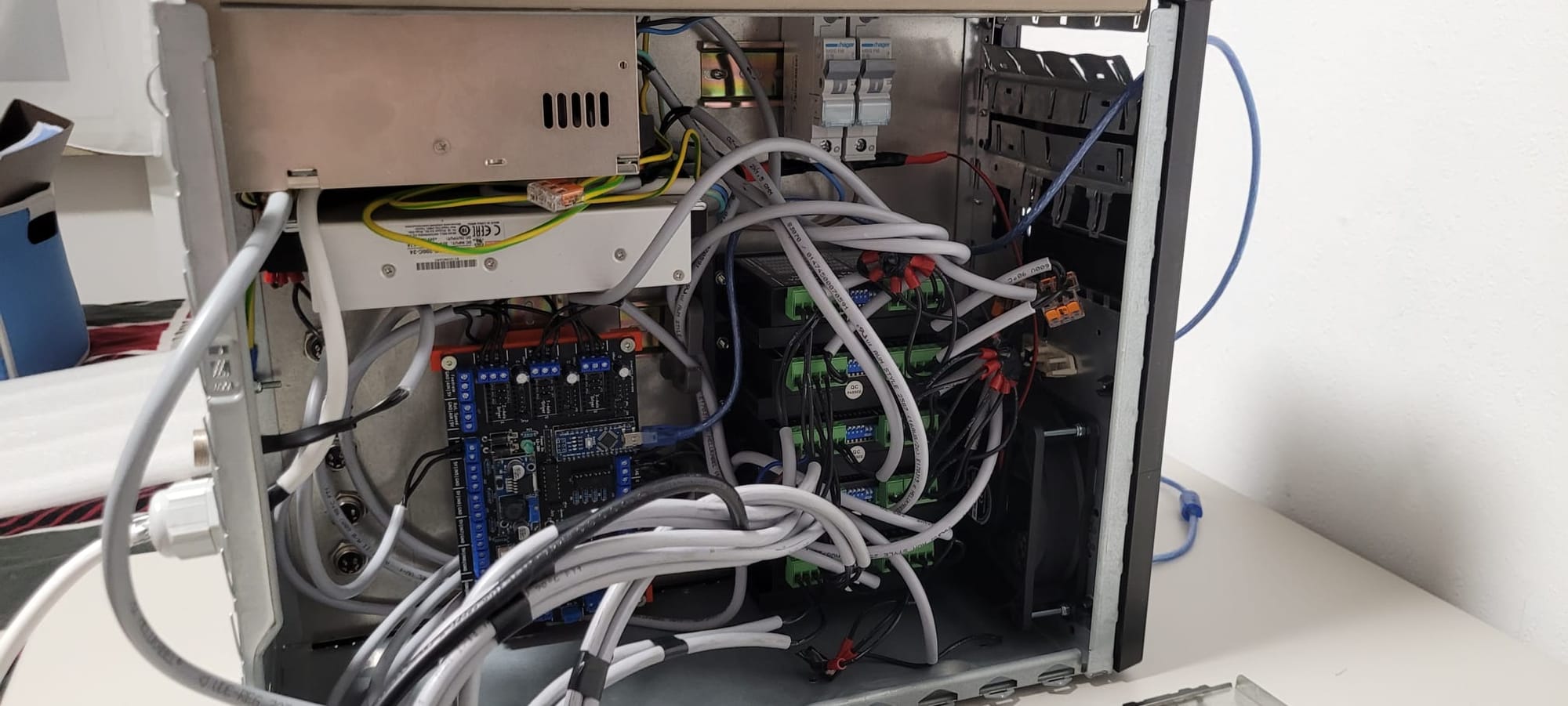 Im Anschluss kam noch mein persönlicher Endgegner. Auch wenn ich einen Abschluss in Elektrotechnik habe, war der Schaltschrank für die Fräse eine kleine Meisterleistung. Es müssen alle benötigten elektr. Bausteine vorhanden sein. Alle müssen in ein PC-Gehäuse passen, sinnvoll angeordnet und sicher fixiert werden. Jedes Kabel muss richtig angeschlossen werden, jeder Stecker, jede Krimpe muss perfekt sitzen, da es sonst später zu Signalfehlern kommen kann. Jedes Steuerkabel ist geschirmt und alle Schaltkreise separat verkabelt worden.