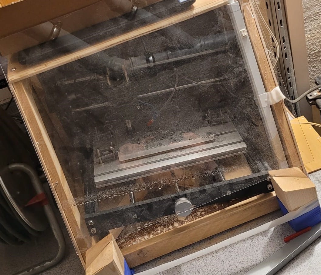 Ich habe die Fräse nun nochmals umgebaut und in ein selbst gebautes Gehäuse verfrachtet. Nun bleibt der Staub im Inneren und der Controller, bzw. alle empfindlichen Bauteile sind außerhalb und von Vibrationen entkoppelt.